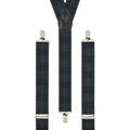 Green and navy tartan braces, handmade in London using hardwearing silver finish clips and slides and completed with leather kite patch.