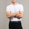 This uncommon green leather belt is completed with the timeless Westend buckle, made from solid brass with a nickel free silver finish.