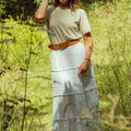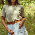 A 2" (50 mm) wide tan leather belt beautifully showcasing the natural grain and texture of the sustainably sourced vegetable tanned leather.